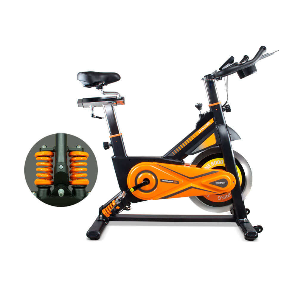 TRAINER ALPINE 8500 es una novedosa Bici de Spinning estática de Alta Gama con Sistema de Absorción de Impactos y muelles estabilizadores. Gracias a esto, podrás practicar ejercicio físico de alta exigencia con la máxima seguridad sin que tu cuerpo se resienta, previniendo así posibles lesiones.