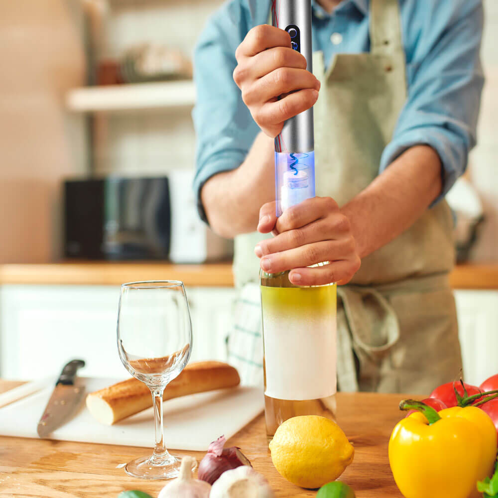 Sencillo e intuitivo gracias a sus dos botones: Usa un botón para extraer el corcho de la botella y el otro botón para liberarlo y dejarlo listo para el próximo uso. Además en su estructura cuenta con una LUZ LED para un uso seguro y preciso, que a la vez le aporta distinción y elegancia.