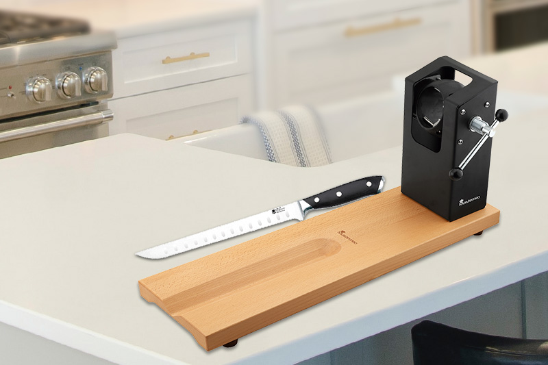 Me encanta cómo sujeta el jamón para poder cortarlo bien y con seguridad. Como sugerencia, pónganle una puntera allen también en uno de los lados de la empuñadura de la llave allen. Gracias.