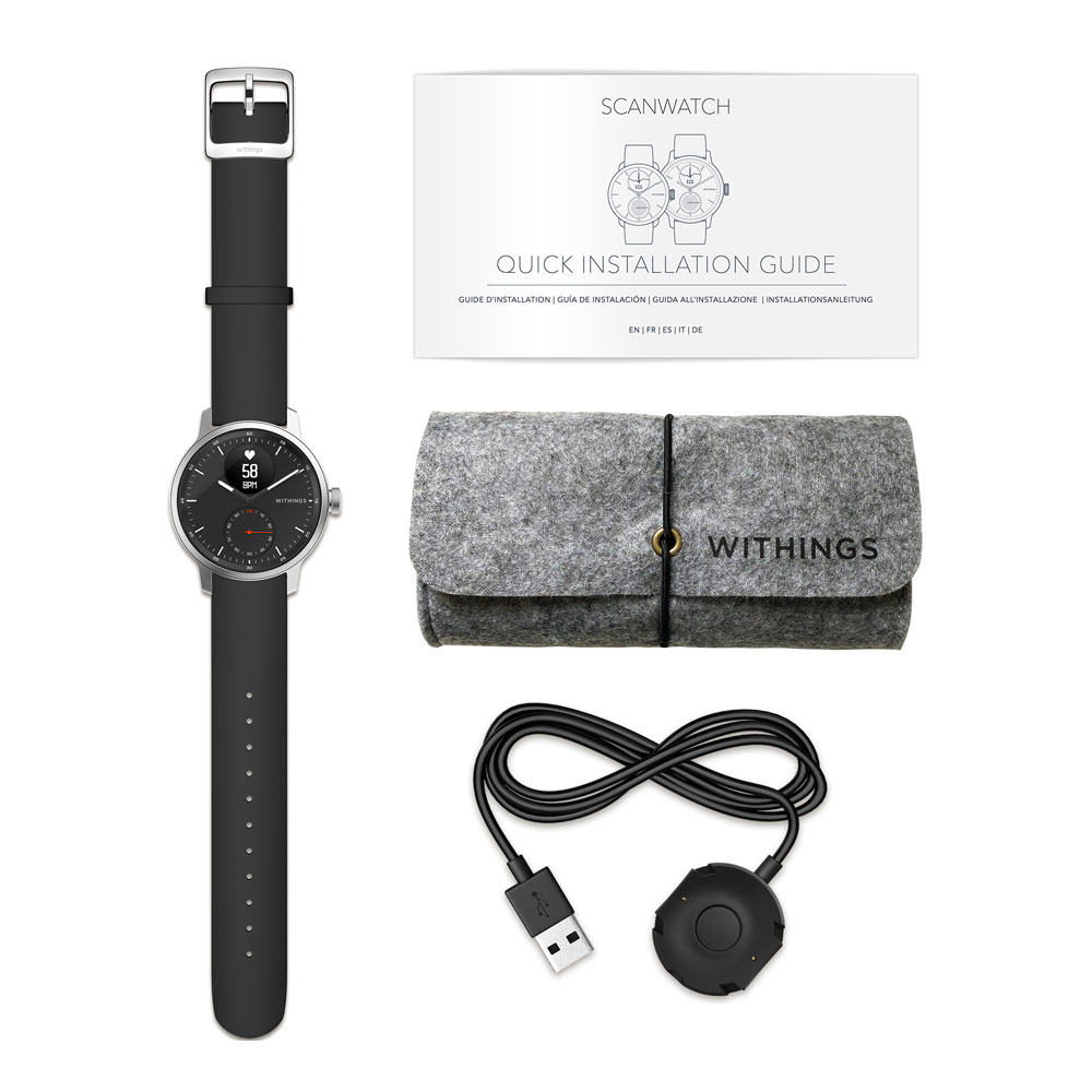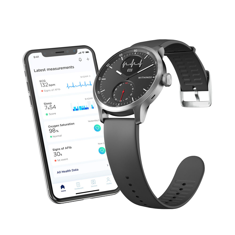 Desarrollado con profesionales de instituciones de renombre mundial, ScanWatch incluye un ECG de precisión clínica, un oxímetro para las mediciones de saturación del oxígeno en sangre (SpO2) y ofrece una duración excepcional de la batería de hasta 30 días.